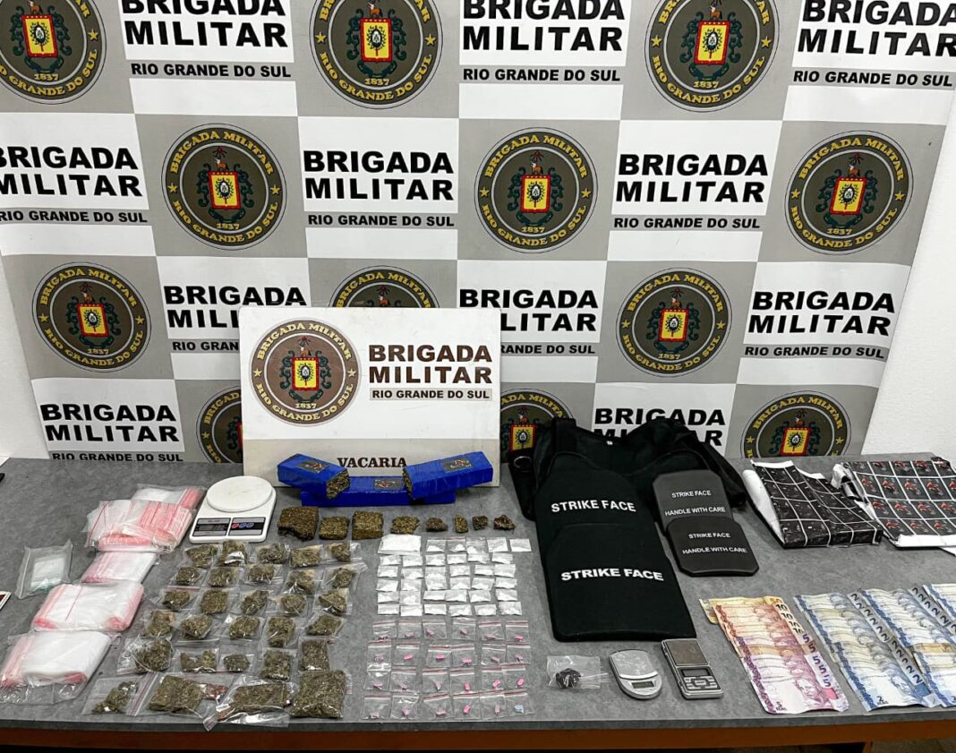 Na noite de terça-feira (16/09), a Brigada Militar, por meio do 10º Batalhão de Polícia Militar, prendeu um homem por tráfico de entorpecentes no bairro Franciosi, em Vacaria.Durante ação da força tática, os policiais abordaram o suspeito e localizaram em sua mochila uma grande quantidade de drogas, incluindo maconha, cocaína, drogas sintéticas e substância semelhante à merla. Na residência do indivíduo, foram encontradas balanças de precisão, dinheiro, materiais para embalar drogas, além de uma capa de colete e duas placas balísticas.Ao todo, foram apreendidos 40 porções de maconha (2,245 Kg), 36 porções de cocaína (56 g), 24 comprimidos de drogas sintéticas, 1 porção de merla (15 g), 2 placas balísticas, 1 capa de colete, 3 balanças de precisão, dinheiro e materiais para embalar drogas.O suspeito recebeu voz de prisão em flagrante e foi apresentado na Delegacia de Polícia para os procedimentos legais cabíveis.A Brigada Militar reforça seu compromisso como patrimônio do povo gaúcho, seguindo firme rumo aos 200 anos de história.