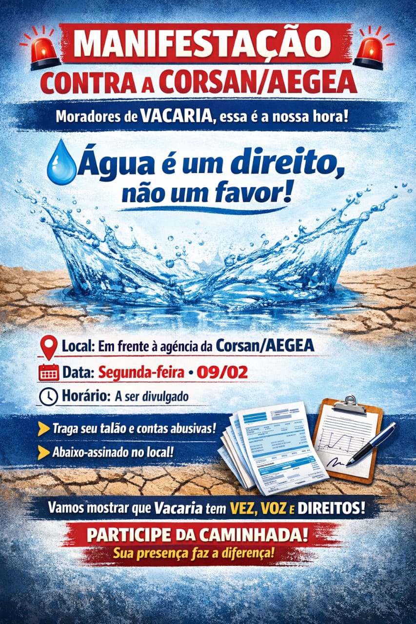 A paciência do povo de Vacaria chegou ao limite. Diante de falhas no abastecimento de água e de cobranças que muitos moradores consideram abusivas, a comunidade organiza um grande ato público para a próxima segunda-feira, dia 9 de fevereiro. O objetivo é claro: mostrar que a união da população é a força necessária para garantir que direitos básicos sejam respeitados e que os responsáveis pela atual situação sejam devidamente responsabilizados.Sob o lema “Água é um direito, não um favor!”, a manifestação convoca todos os cidadãos que se sentem lesados pela gestão da Corsan/Aegea a ocuparem as ruas. É o momento de transformar a indignação das redes sociais em presença física e voz ativa.